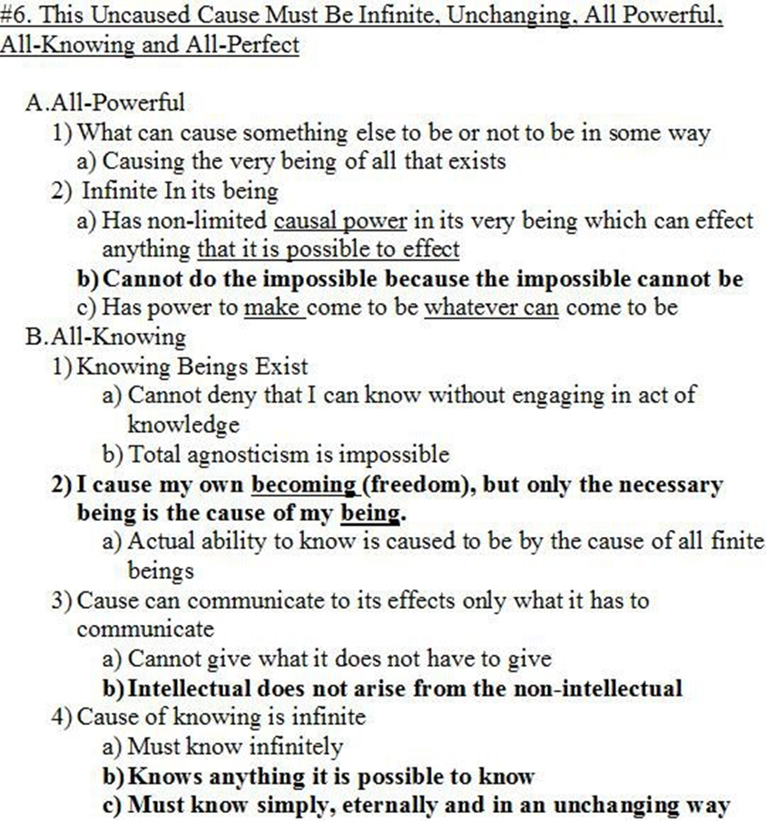 6. This uncaused cause must be infinite, unchanging, all-powerful, all-knowing, all-perfect.